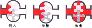 ZW-LUS系列螺旋雙轉子流量計對流體流量的測定是在計量腔體內完成的。一對螺旋轉子在液體的壓力下轉動,轉子與計量腔壁間形成的封閉空間(圖陰影部分)每回轉一次排出8倍陰影體積。因此根據(jù)這一關系,只要計量轉子回轉的次數(shù),即可計算出流量累積量,根據(jù)每秒的轉數(shù),即可測出瞬時流量。如下圖所示,該流量計通過一對回轉的特殊螺旋轉子,直接測量液體流量的容積。