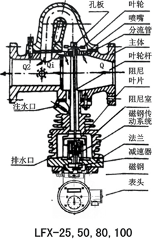 When the steam enters the body, because the throttling effect of orifice plate and nozzle, the inclined hole part of the steam enters the body through the shunt diversion pipeline, jet rotor impeller, a torque, the impeller shaft is arranged at the lower part of the damping damping blade, blade in the water filled radiator body rotation, the rotation by the damping effect of the impeller, kinetic energy this impeller can be effectively absorbed by the jet, the phase equilibrium in the impeller shaft braking torque torque and damping impeller speed of rotation.The steam enters the body is in proportion to shunt shunt in the pipeline, and the impeller speed and flow rate is proportional to size, so the impeller speed and through the full steam flow is proportional to the rotation of the impeller shaft, with the gear change to the appropriate speed, then the pointer through magnetic coupling to counter on the dial, can be directly read the numerical flow of steam.Equipped with pulse generator, we can realize the remote display.The specific figure: