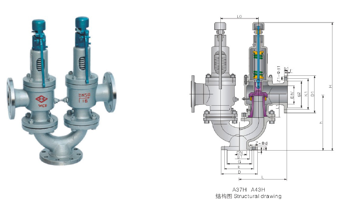 A38Y、A43H、A37H系列雙聯(lián)彈簧式安全閥是在Y型接頭上裝設(shè)兩個(gè)同樣規(guī)格的A48Y或A47H型安全閥而構(gòu)成,適用于工作溫度≤350℃的蒸汽、水等介質(zhì)的設(shè)備和管路上。作為超壓保護(hù)裝置。